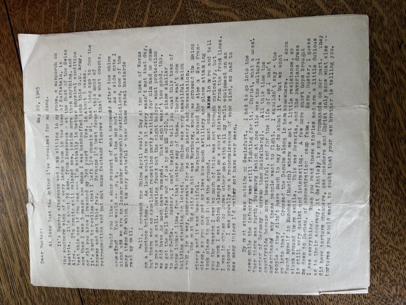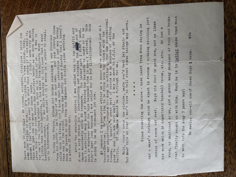 There were 50,000 dead — SS troops, soldiers, civilians — piled in a heap like sticks of wood. I'm telling you these things, Coke, because I don't want to ever talk about them again if I can help it. This was just one of many of these camps. I didn't move very much after that. Just extended around the Austrian border as we were waiting for one of the German armies to fold up in front of us. I was in a little town called Lenzing, a few miles from Salzberg when hostilities ceased. I was while staying in this town that I went up to Berchtesgaden, the account of it I wrote in a letter to Ethel.